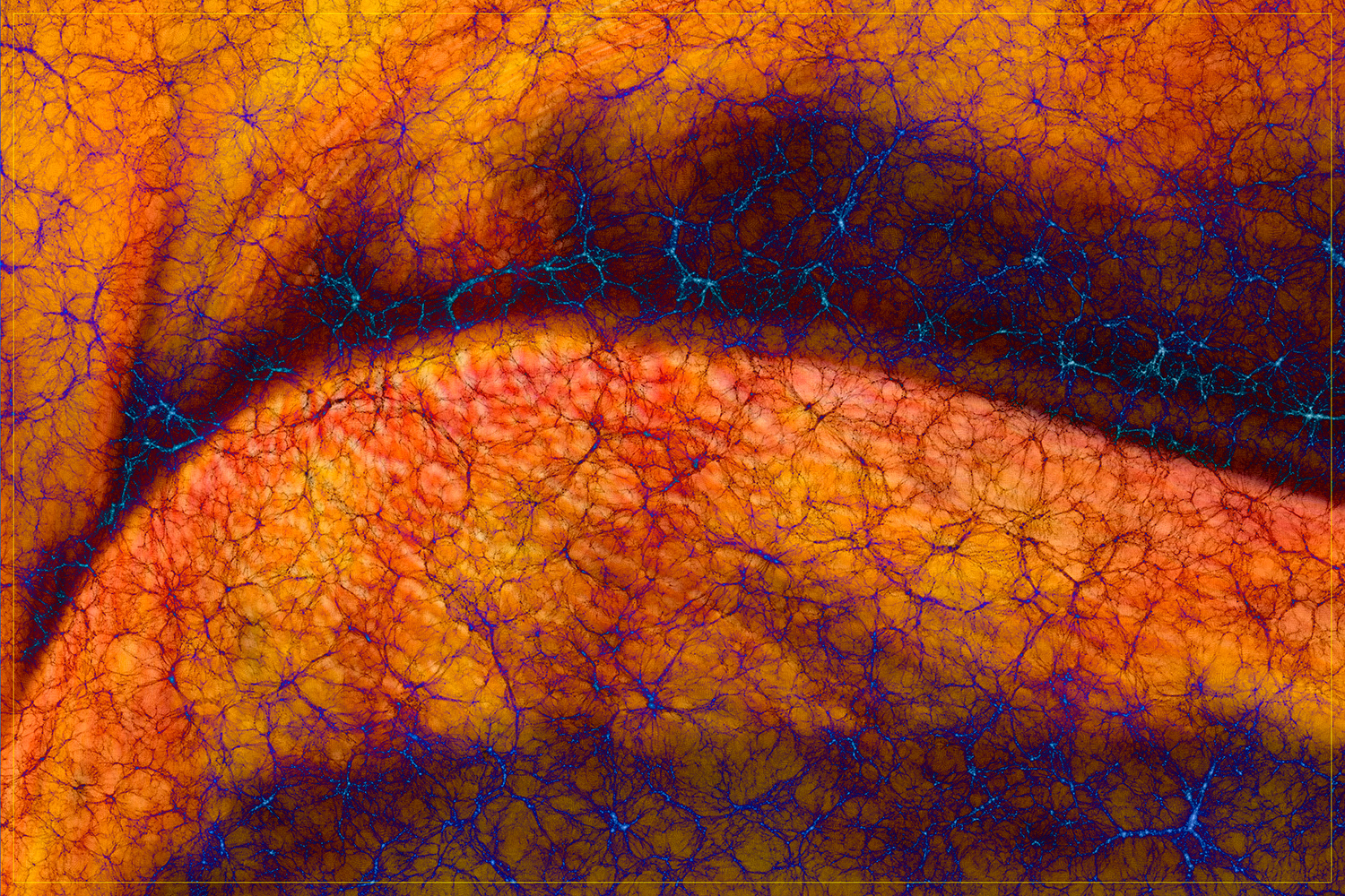 Abstract and other images set against the background of the Bolshoi Simulation of the distribution of the Galaxies. Every white dot in the first image is a GALAXY!!, The width of the image is 3.5 Billion Light Years. The simulation closely resembles the observed Universe. That there is structure on such a grand scale prompted this project